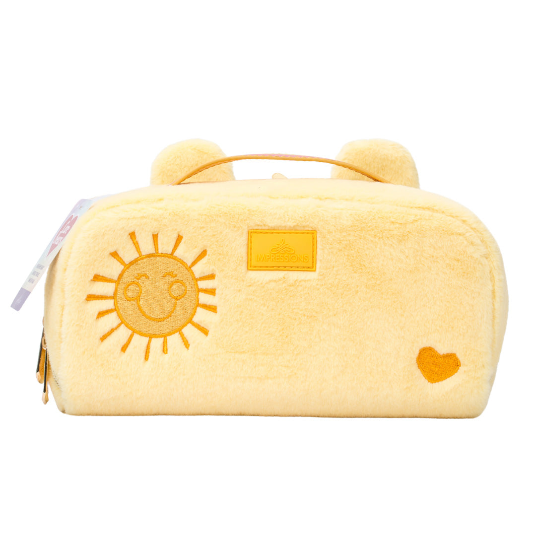 Bring your essentials everywhere and get your shine on with the Care Bears™️ Funshine Bear makeup bag.This plush bag boasts charming embroidered details on both the front and back, complete with adorable 3D plush ears for an extra touch of cuteness. Open it up to reveal a spacious, lined interior with both zippered and open pockets.Perfect for keeping your essentials both organized and adorable.
