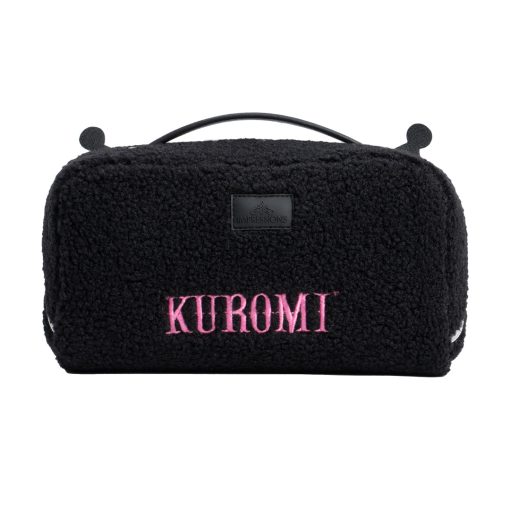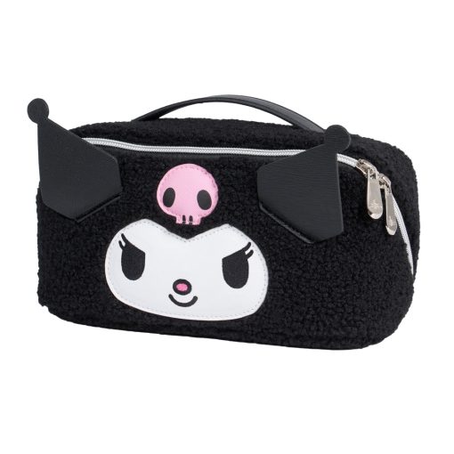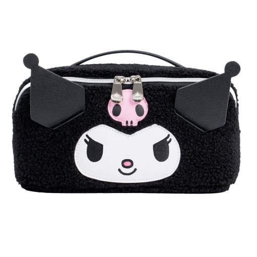 Keep all of your beauty and travel essentials together in this devilishly cute makeup bag! This cozy bag features Kuromi’s face embroidered on the front, 3D ears, and signature skull applique.Flip to the backside to reveal Kuromi’s signature logo!