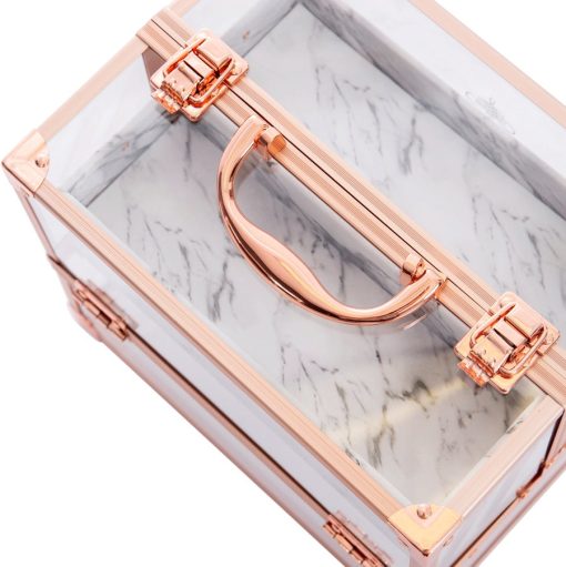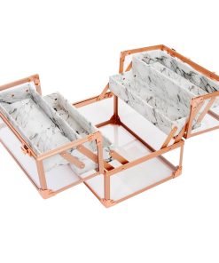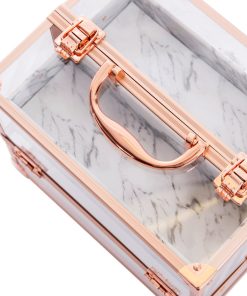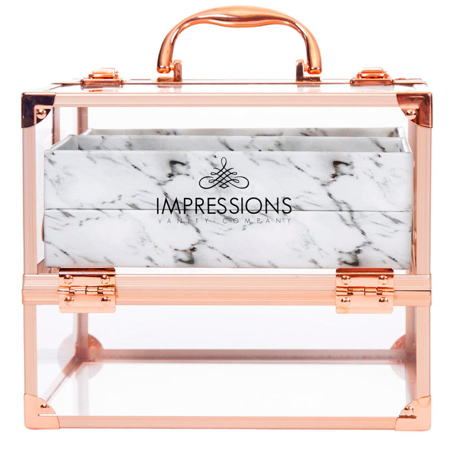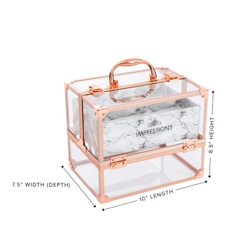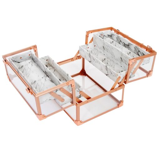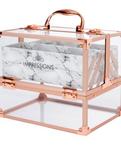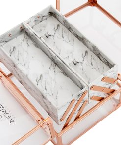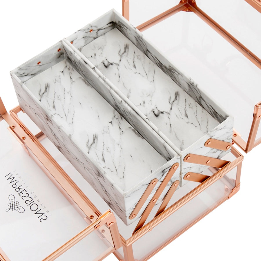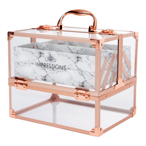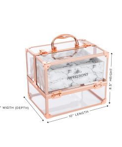 Savvy Makeup CaseShowcase your best makeup collection with the Savvy Makeup Case! This cute makeup case is designed to fuse modernity — with its crystal clear panels and rose gold trim — and the antiquity of marble. Pop open the latches for easy access to your accessories. The Savvy Makeup Case is equipped with 4 extendable compartments lined with a marble patterned leatherette. Features a large storage area for your larger vanity necessities.