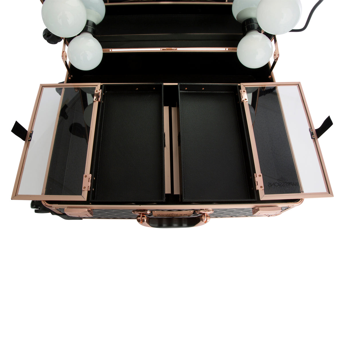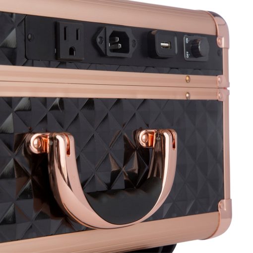 Slay anywhere with our Slaycase XLS Makeup Vanity Case! This case comes with everything you’ll need from its built-in mirror it the classic Hollywood style light bulbs. Plug in the case to an outlet and power up the lights with the dimmer switch so you can get that ideal lighting. The case also has a USB port and electrical outlet for powering up your vanity items. The SlayCase has features tiered compartments that are detachable and can hook to the sides for extra room. Once you’re done, simply pack up and roll away with your vanity set!