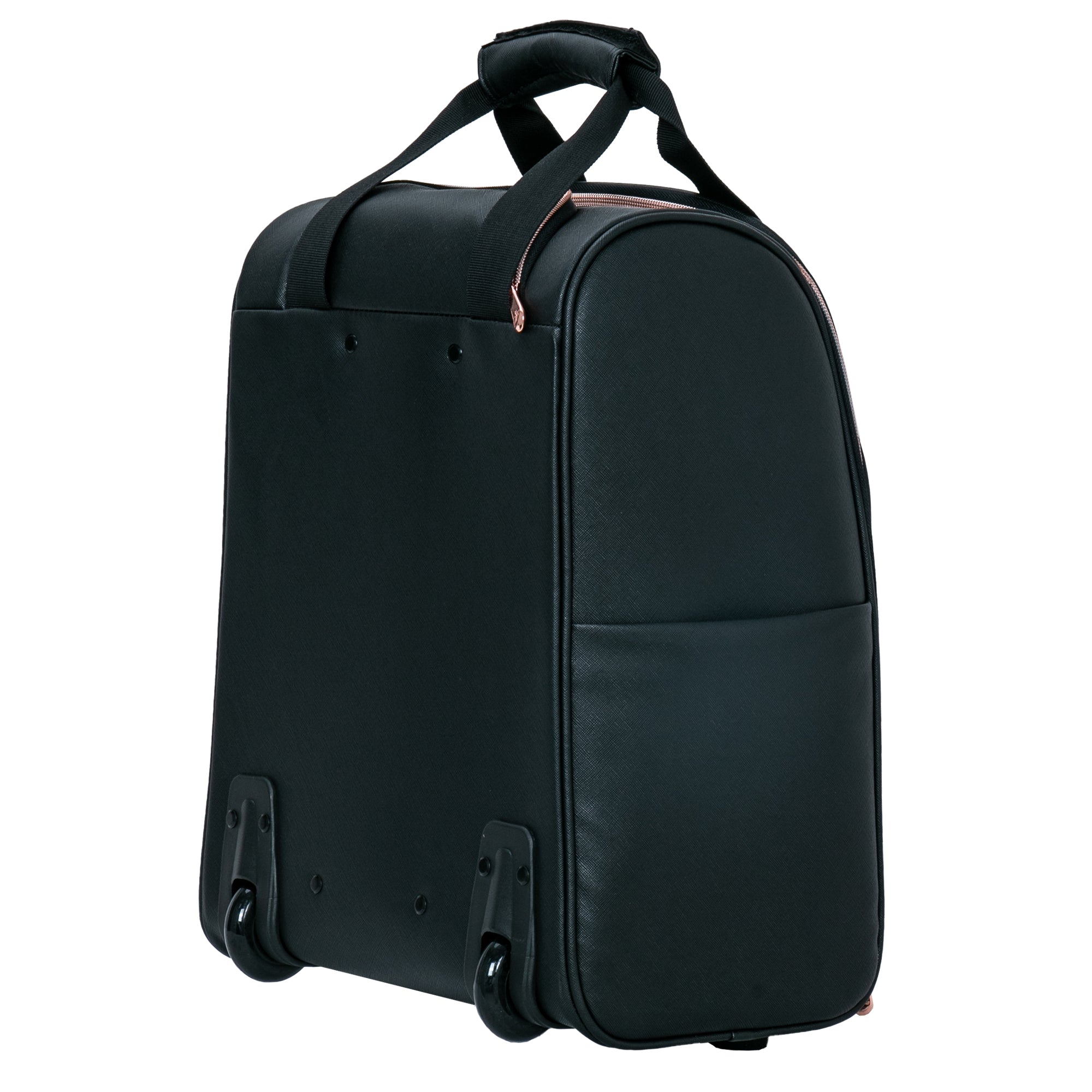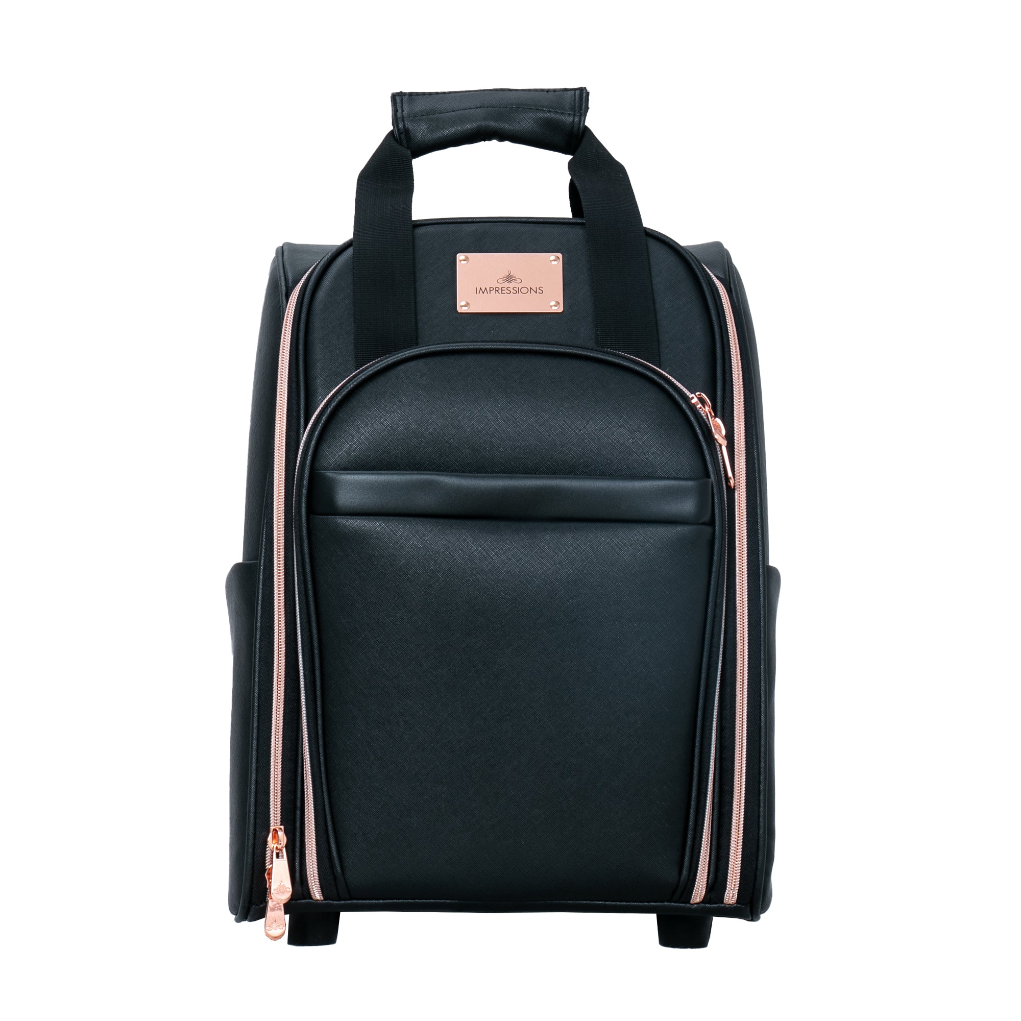The Impressions Vanity SLAYssentials LUXE Travel Organizer Makeup Case, features high-quality faux leather exterior with contrast rose gold trim, 4 removable pouches to help organize all your makeup accessories, extendable handle and wheels that make traveling a breeze.