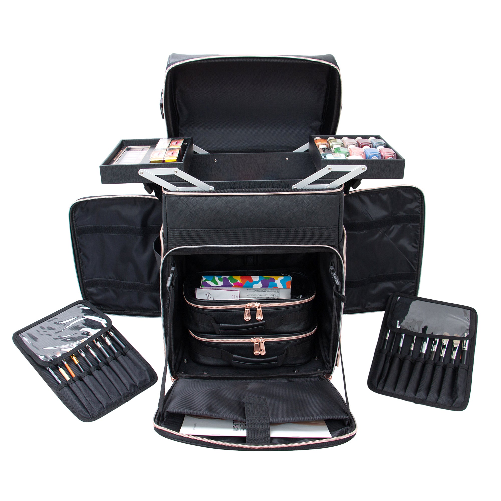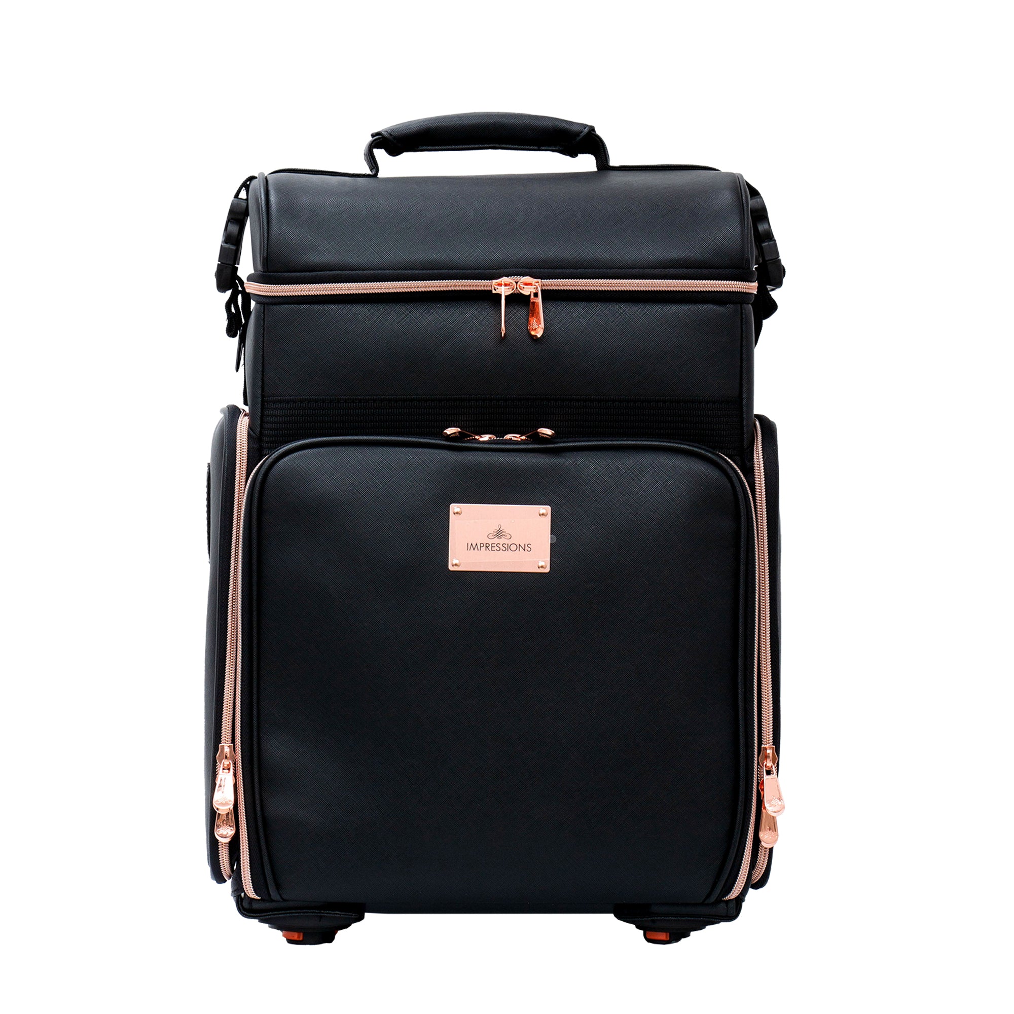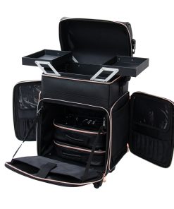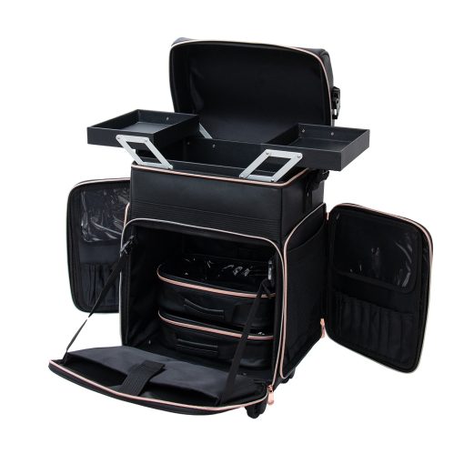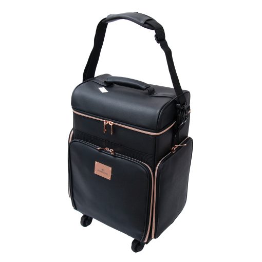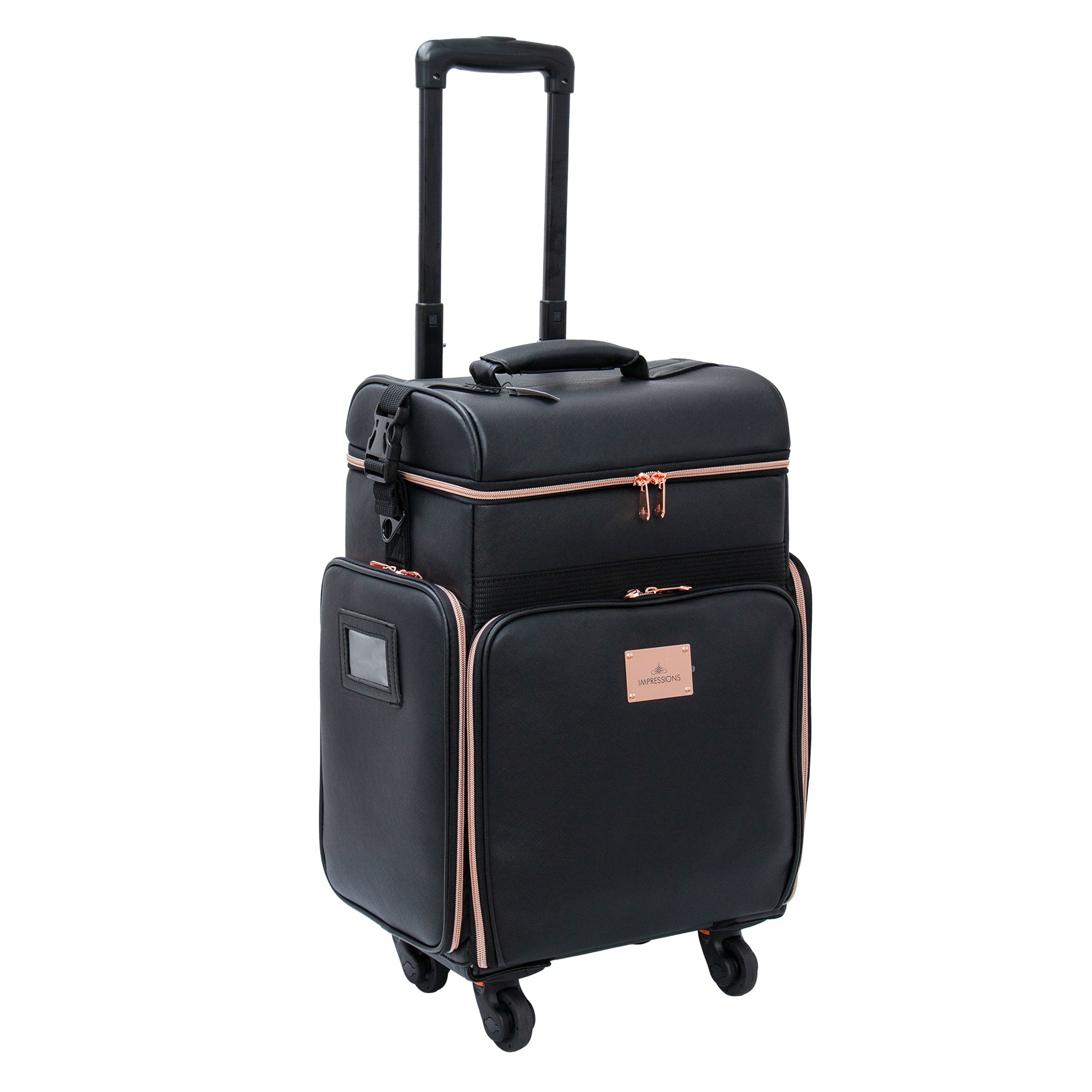 The Impressions Vanity SLAYssentials LUXE 24-inch Travel Organizer Makeup Case, features high-quality faux leather exterior with contrast rose gold trim. Superior mobility with 360º spinner capability and 4 removable wheels. This makeup case is the perfect companion for glam on-the-go. Featuring bonus pouches and makeup brush holders to help organize all your makeup accessories.