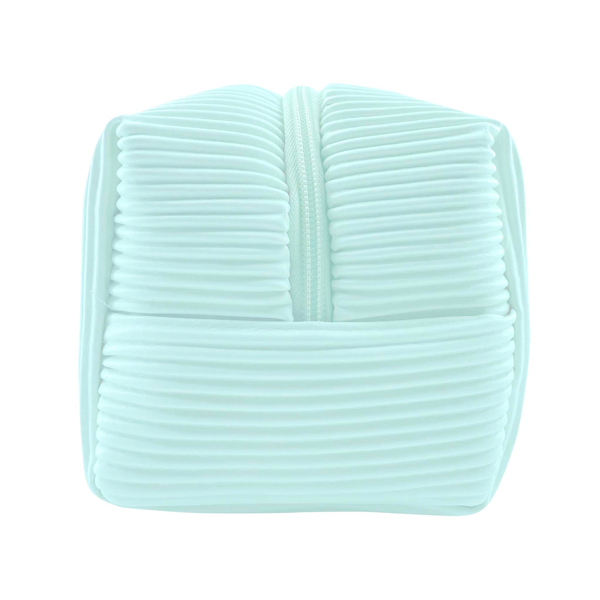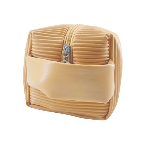 Constructed with sleek faux leather and highlighted by a vertical quilted pattern and a side handle for effortless retrieval. Boasting a main top zippered compartment and roomy interior, you can conveniently arrange and access your makeup must-haves.