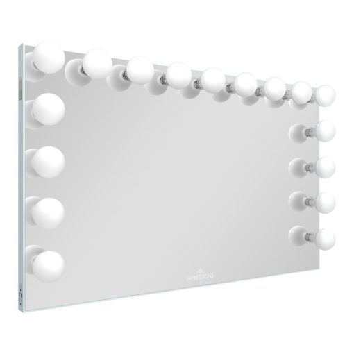 Move out of the way for the ultimate, delux show shopper to top your stunning vanity table, the Hollywood Glow® Pro Max Vanity Mirror. This vanity mirror is large and in charge, coming in at 52’’ x 31.5’’, resulting in the grandest Hollywood Style mirror to date. If you’re looking for the most astonishing mirror of all-time, look no further, the Hollywood Glow® Pro Max Vanity Mirror is for you! With 17 quality LED bulbs featured throughout the border of this grand mirror, offering the most exceptional amount of lighting for all makeup applications. The Hollywood Glam design that provides perfect, even lighting and superior mirror reflection clarity. Featuring 17 light sockets for bright lighting equipped with a dimmer switch and convenient USB and power outlets. The mirror is encased in a robust aluminum body that can easily be wall-mounted with the pre-installed mounting hardware or mounted on a SlayStation table.Equipped with Bluetooth, the Hollywood Glow® Pro Max Vanity mirror has wireless Bluetooth speakers!Only Impressions Vanity® Hollywood Vanity Mirrors are certified by ETL, CE, and RoHS safety standards.
