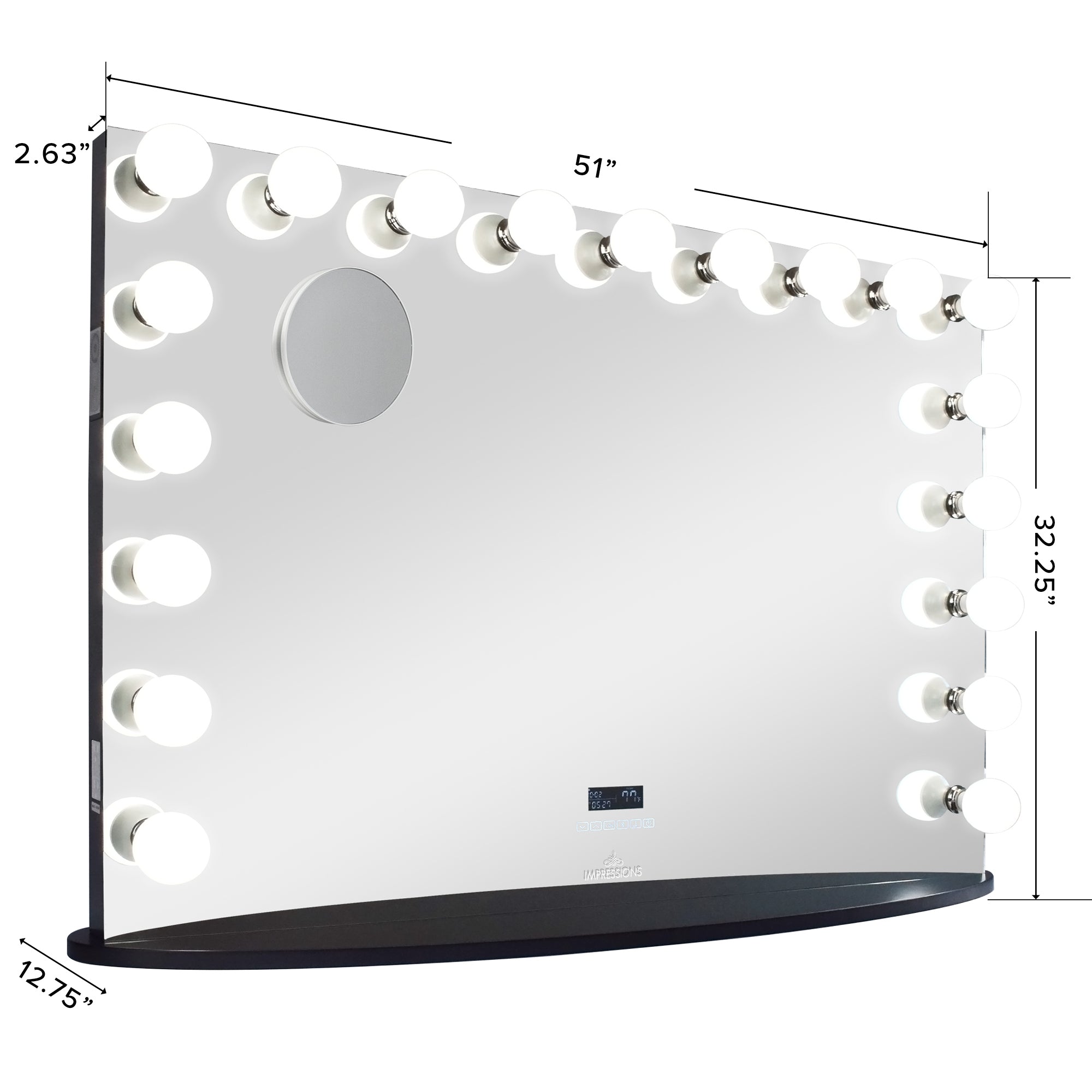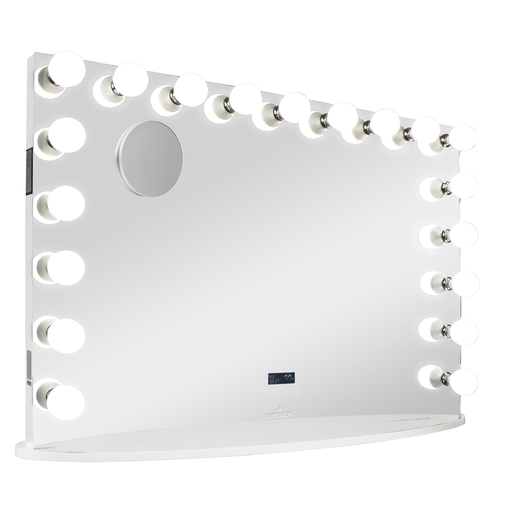 The Impressions Vanity Hollywood Premiere Pro Max Vanity Mirror is the grandest classic vanity experience— the Hollywood Glam design that provides perfect, even lighting and superior mirror reflection clarity. Featuring 19 light sockets for bright lighting with dimming capabilities and equipped with convenient USB and power outlets. The mirror is encased in a robust aluminum body that can easily be wall-mounted with the pre-installed mounting hardware or place it on a SlayStation with the included base!Bluetooth: The Hollywood Premiere Pro Max has wireless Bluetooth speakers with touch-sensitive buttons and a backlit LED screen integrated into the mirror for controlling Bluetooth pairing and volume adjustment. It can also let you check the current temperature to make sure you don’t have a makeup meltdown! Only Impressions Vanity® Hollywood Vanity Mirrors are certified by ETL, CE, and RoHS safety standards.*This product requires Residential Curbside Delivery (Freight Service) within the contiguous United States*