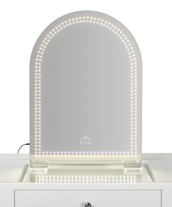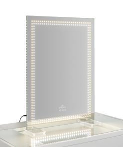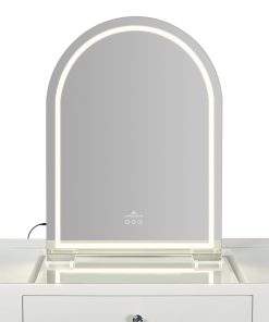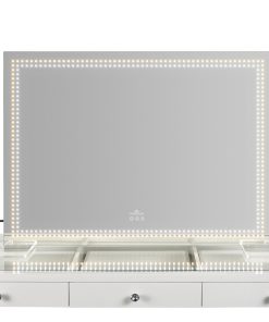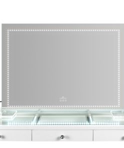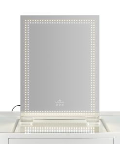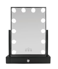 Staying organized while getting ready has never been easier! With a built-in drawer adorned with a crystal knob, the Hollywood Tri-tone XL Makeup Mirror brings Hollywood glamour and functionality to your vanity space. Equipped with built-in long-lasting LED Lights around the mirror for even lighting. Tap the Power button to power it on/off. Tap the Light Color button to switch between cool white, natural and warm light tones. Hold the Light Bulb button down to adjust brightness.