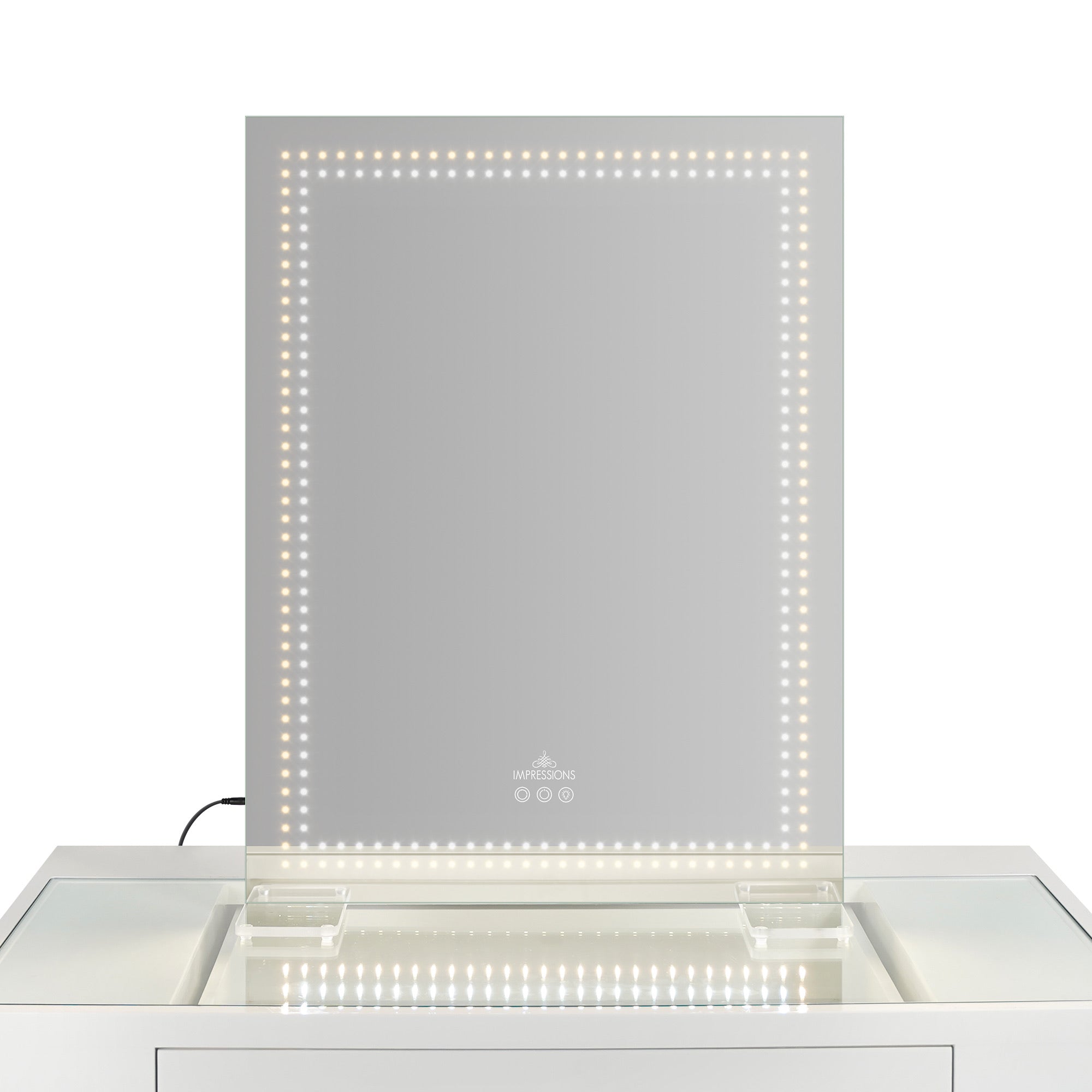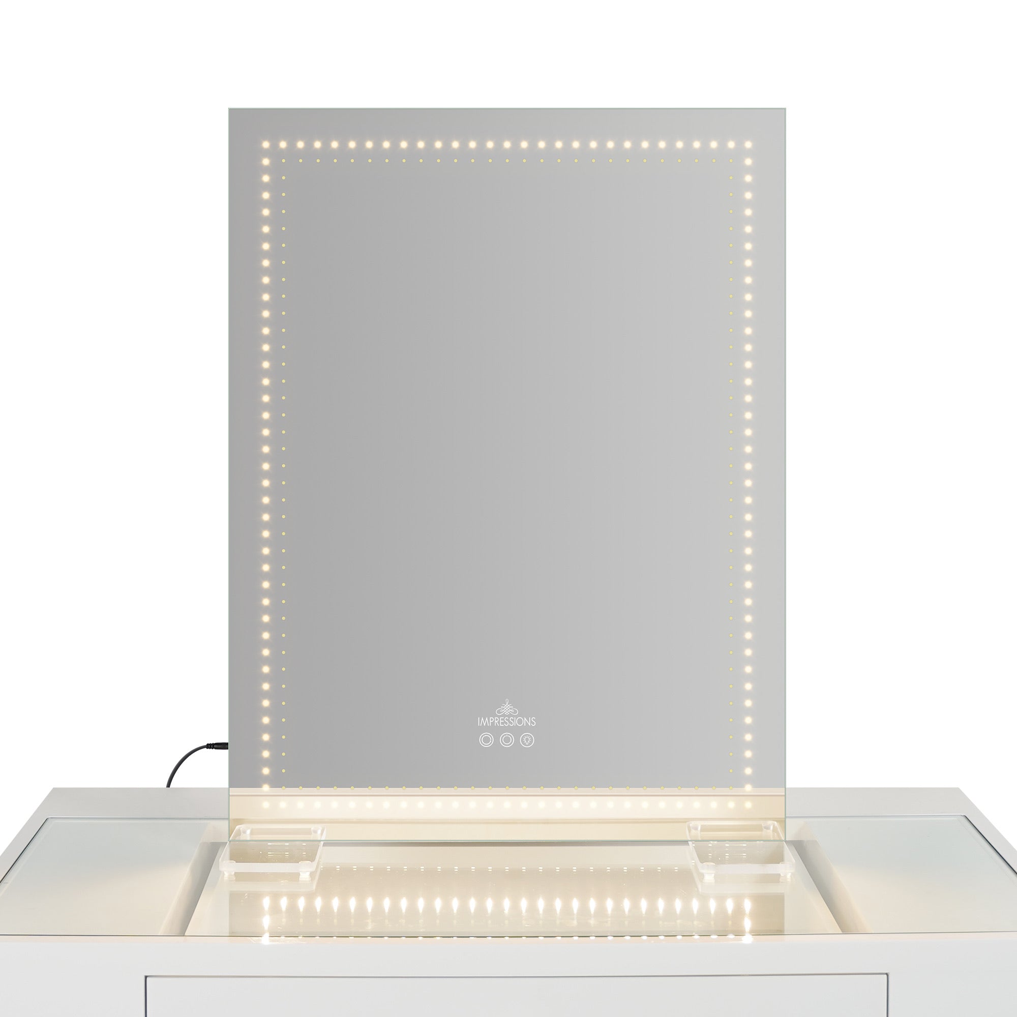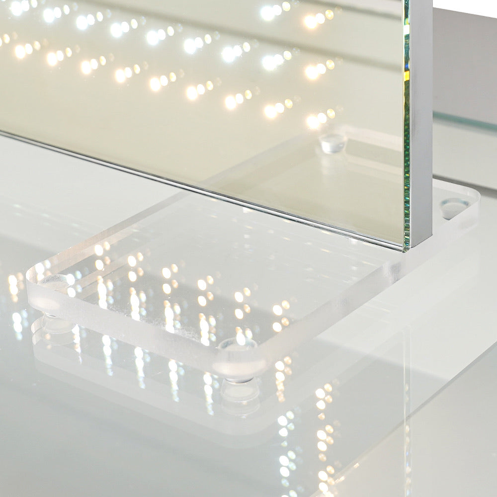 The Stage Lite XL Vanity Mirror is a modern twist on our iconic Hollywood-style mirrors, featuring an ultra-slim aluminum build and removable acrylic legs. Simply tap through the tri tone lighting and enjoy personalized brightness control by holding down the sensor button. Whether you prefer clean lines or graceful curves, step into the spotlight and transform your vanity experience.