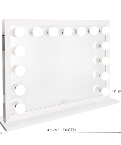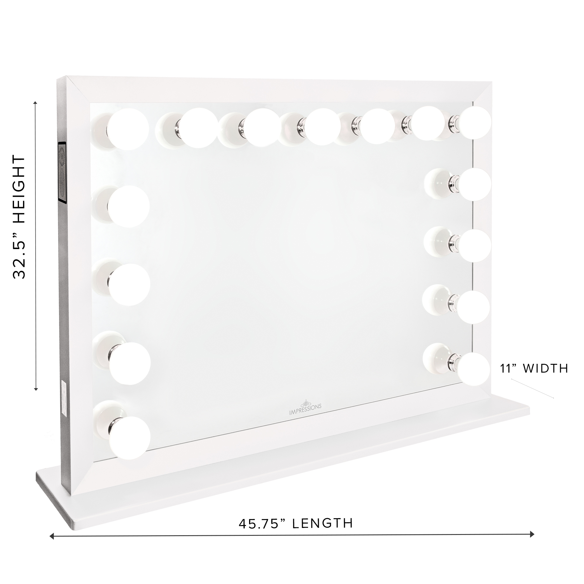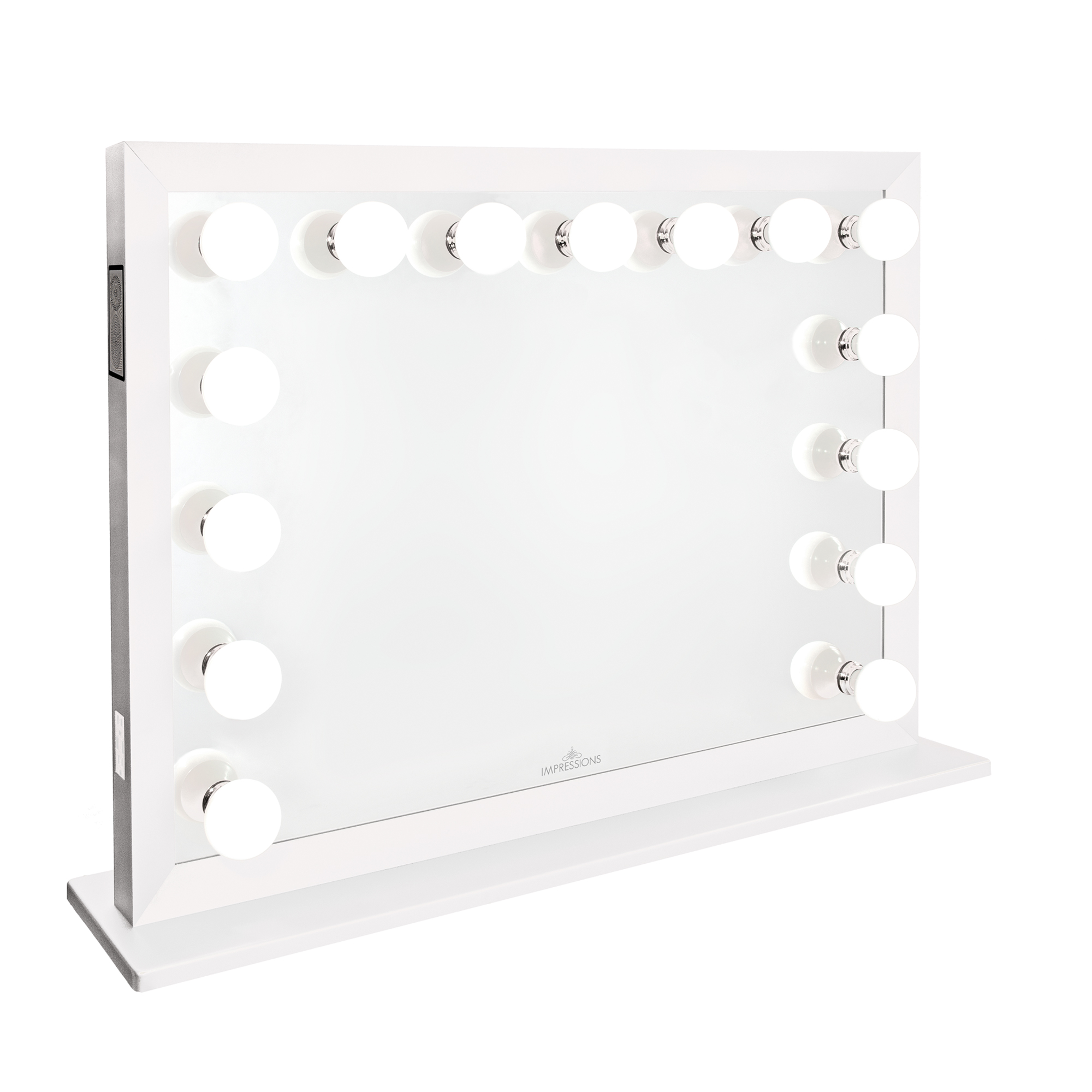Feel like a star with the Impressions Vanity® Starlight Pro Vanity Mirror! Packing standard premium features including the dimmer power switch and dual accessory power outlets in a light metal body, it also comes with a detachable base designed and convenient mounting slots for both tabletop and wall mounted setups.If you are looking for a modern and bold statement piece for your home, look no further than our Starlight Pro Vanity Mirror. This mirror is “wow-factor” to any glam room. The Starlight Pro features wireless Bluetooth Speaker that lets you pair the Bluetooth to the mirror and lets you adjust volume.