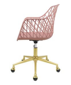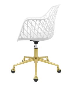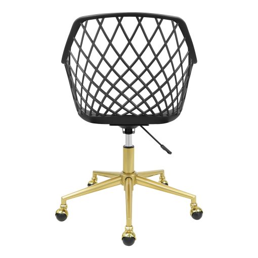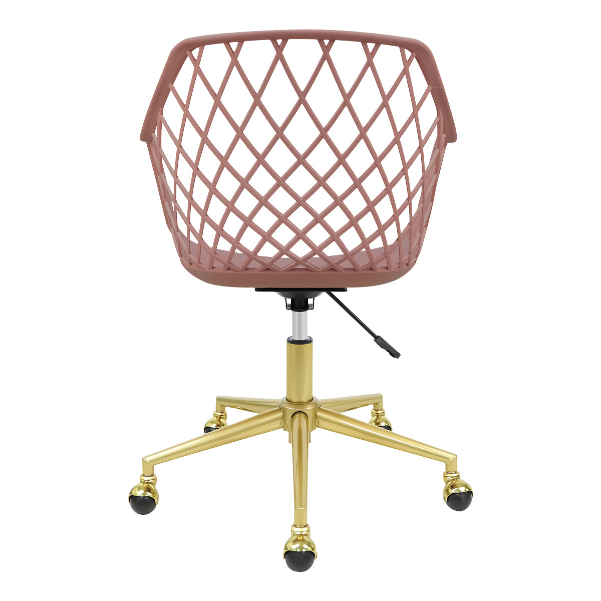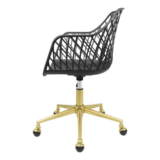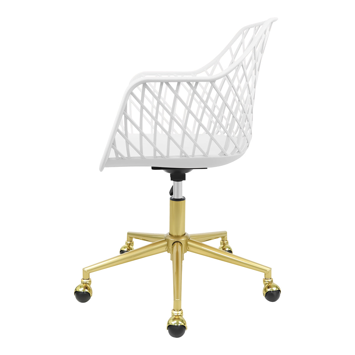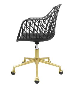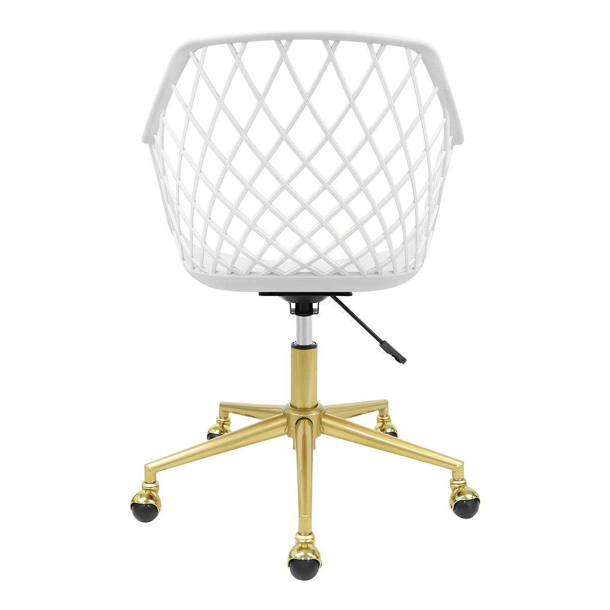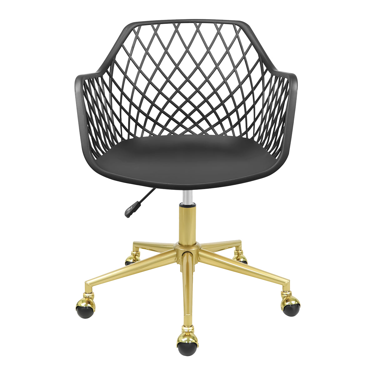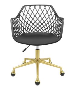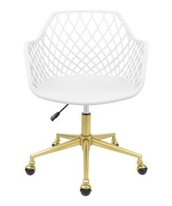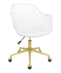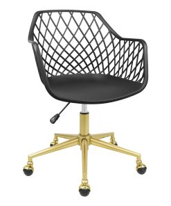 The Robin Chair embraces classic, mid-century modern style with the criss-cross plastic shell design. Crafted with a one-piece molded plastic chair seat and back featuring a unique lattice cutout pattern and brushed gold fixtures. With its 5 wheel base, the Robin chair is perhaps the most practical and durable seat you’ll ever sit upon. The waterproof and easy to clean design of thick plastic seat, makes it perfect for glam spaces avoiding makeup disasters. The simple clean design fits in with any decor theme. Our products are engineered and tested to meet and exceed industry standards in all areas, weight-bearing exercises included. While we do not provide specific weight limits on seating, this chair is designed to support a full-sized