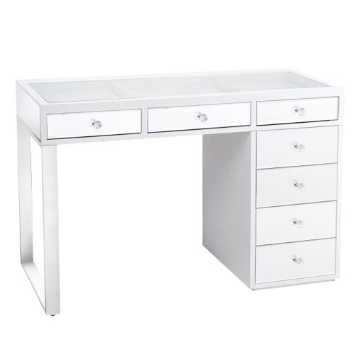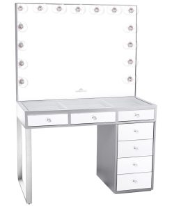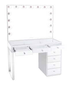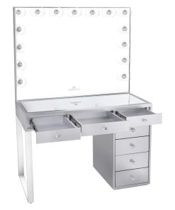 Get ready to slay with our special Mini SlayStation® Kylie 1.0 Vanity Table. Includes 3 drawers across the tabletop and 4 drawers on the right-side that are highlighted with our crystal lux drawer knobs. This SlayStation features a clear glass top to display your favorite vanity accessories and makeup! This ultimate Impressions Vanity Mini SlayStation® Kylie 1.0 Vanity Bundle includes:• Mini SlayStation® Kylie 1.0 Vanity Table• Hollywood Glow® Pro Vanity Mirror