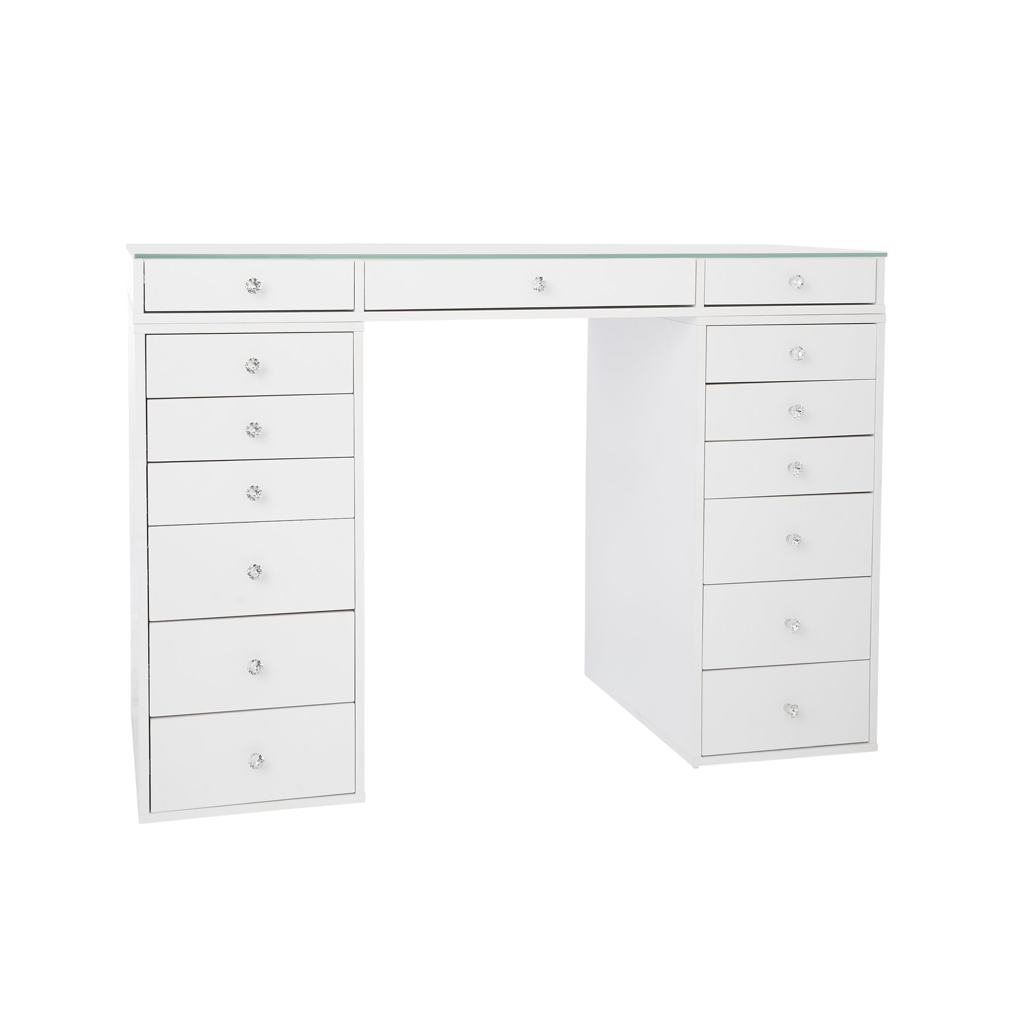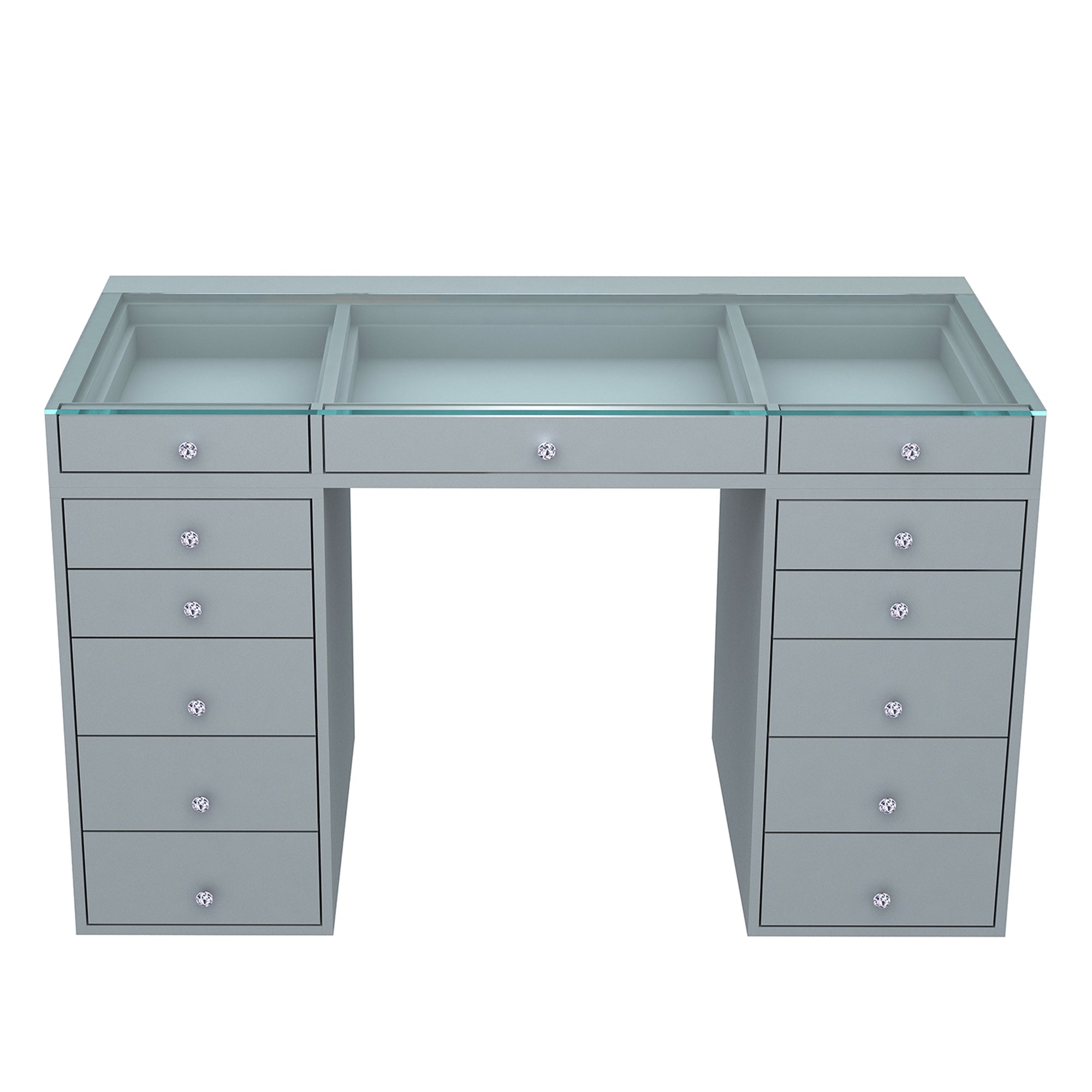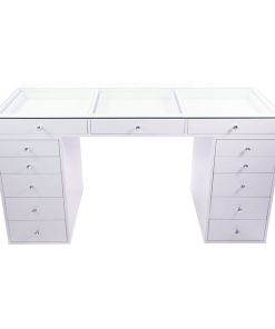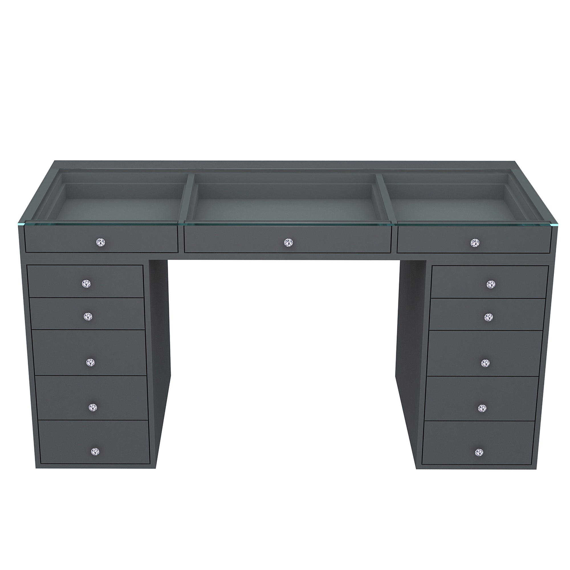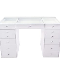 Get ready to slay all day in our SlayStation® Plus 2.0 Tabletop and SlayStation Drawers! This bundle features our SlayStation 2.0 tabletop with pre-drilled holes that includes 3 smooth glide drawers that are highlighted with our crystal lux drawer knobs. The SlayStation features an edge-to-edge clear glass top for you to display your vanity accessories and makeup! Place your chic tabletop on our sturdy SlayStation drawers for the complete look. Features 5 or 6 soft-close drawers that are highlighted with our Crystal Lux Drawer Knobs.