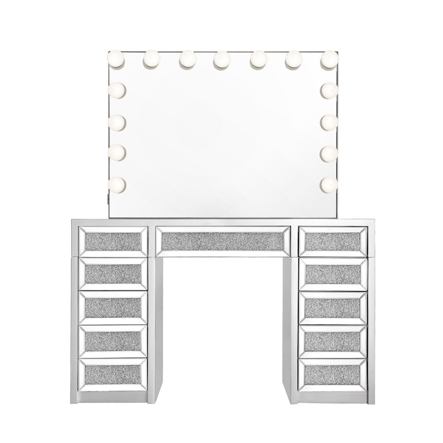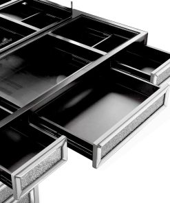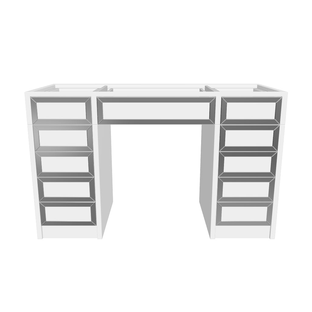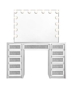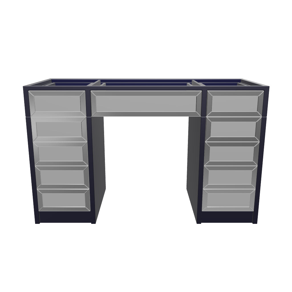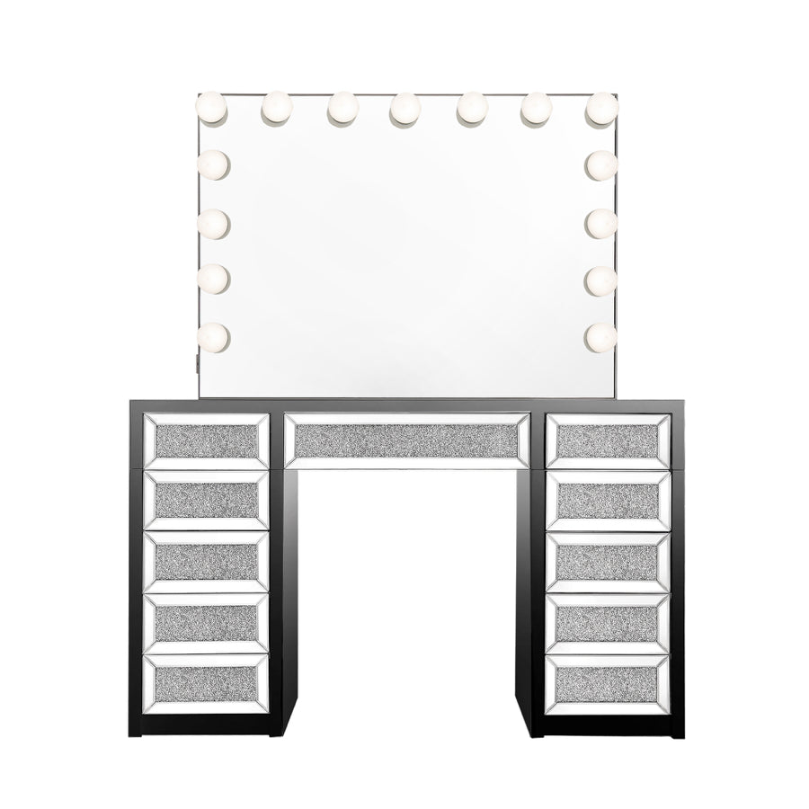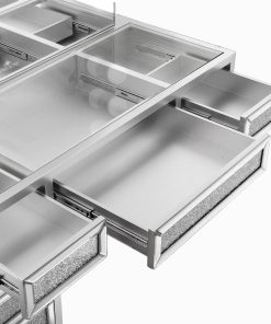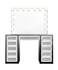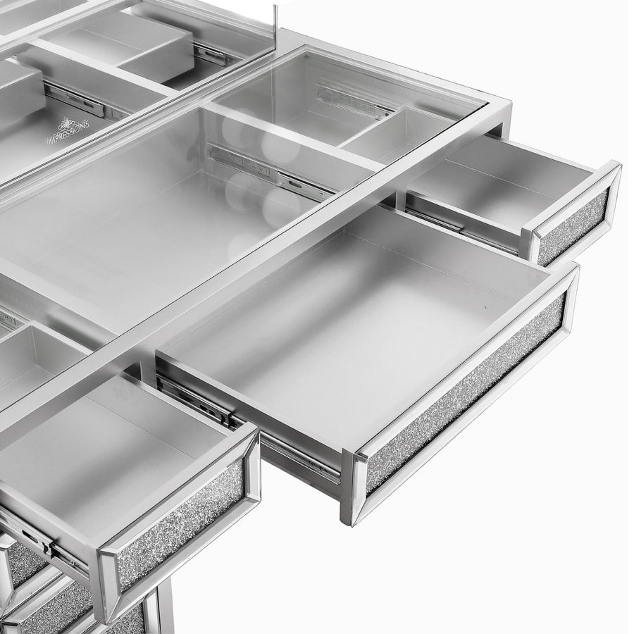 The splendor of the SlayStation Diamond Edition is simply dazzling! This complete set includes the tabletop and two 4-drawer units that are fully assembled.The tabletop features Impressions Vanity’s signature clear-glass top to showcase the best vanity accessories in your collection. Mount your favorite Hollywood Vanity Mirror with the pre-drilled holes!The sides of this SlayStation feature stunning mirrored panels. All of the drawers gleam with a crushed diamond design and are surrounded by a mirrored border. Say goodbye to knobs on your vanity set! Simply push the drawer to open and close.Mirror Display: Hollywood Glow Pro Vanity MirrorMirror sold separatelyRequires curbside delivery**Freight orders(Curbside Delivery) being delivered to states under COVID-19 safer at home policy, may be delayed. Thank you for your patience.