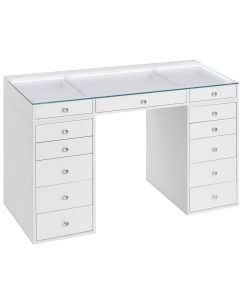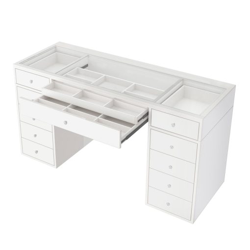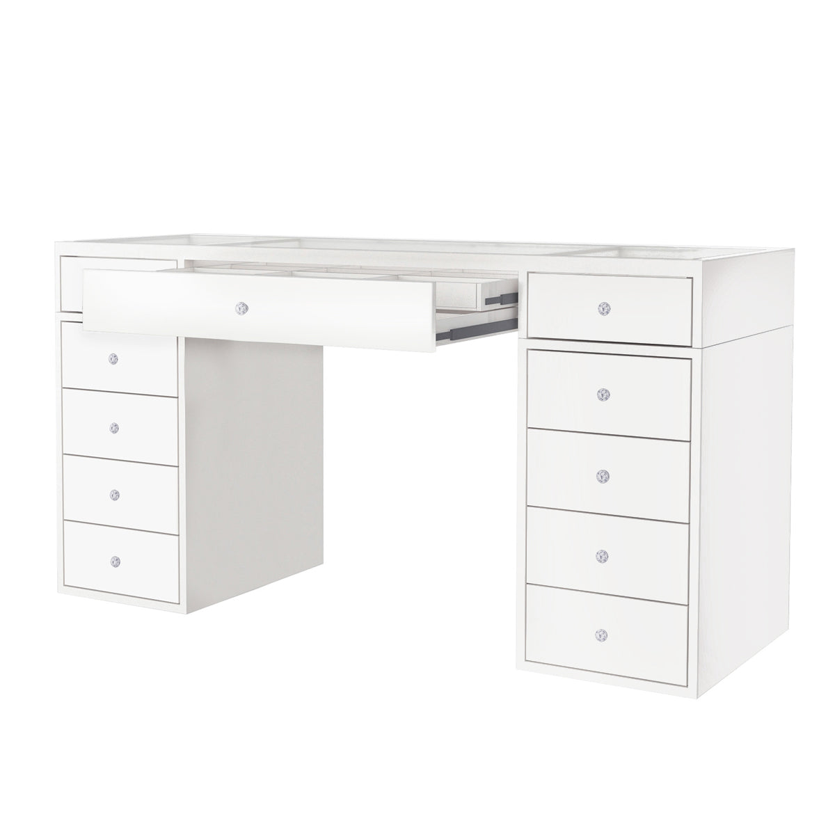 You’ve just manifested your dream glam room with the Luxe Premium Vanity Table. This dazzling SlayStation® table features a table top and drawers and includes 3 tabletop drawers that are highlighted with stunning crystal lux drawer knobs. Includes a secret compartment for extra storage space with 16 preset dividers. Our favorite feature is of course, the edge-to-edge clear glass top for you to display your most cherished vanity accessories and makeup!