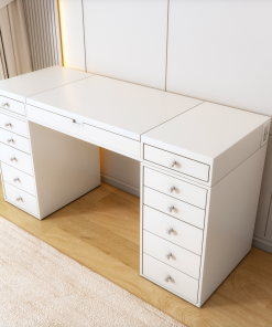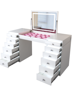 For the table itself, enjoy built-in Bluetooth speakers so you can connect your phone and stream music while you get ready. Pull open the spacious drawers to reveal built-in LED lighting that beautifully illuminates your products while offering ample storage. With thoughtfully placed USB outlets and integrated power options, you can easily charge beauty tools and devices, keeping your routine smooth and uninterrupted. Designed for beauty enthusiasts who appreciate both form and function.