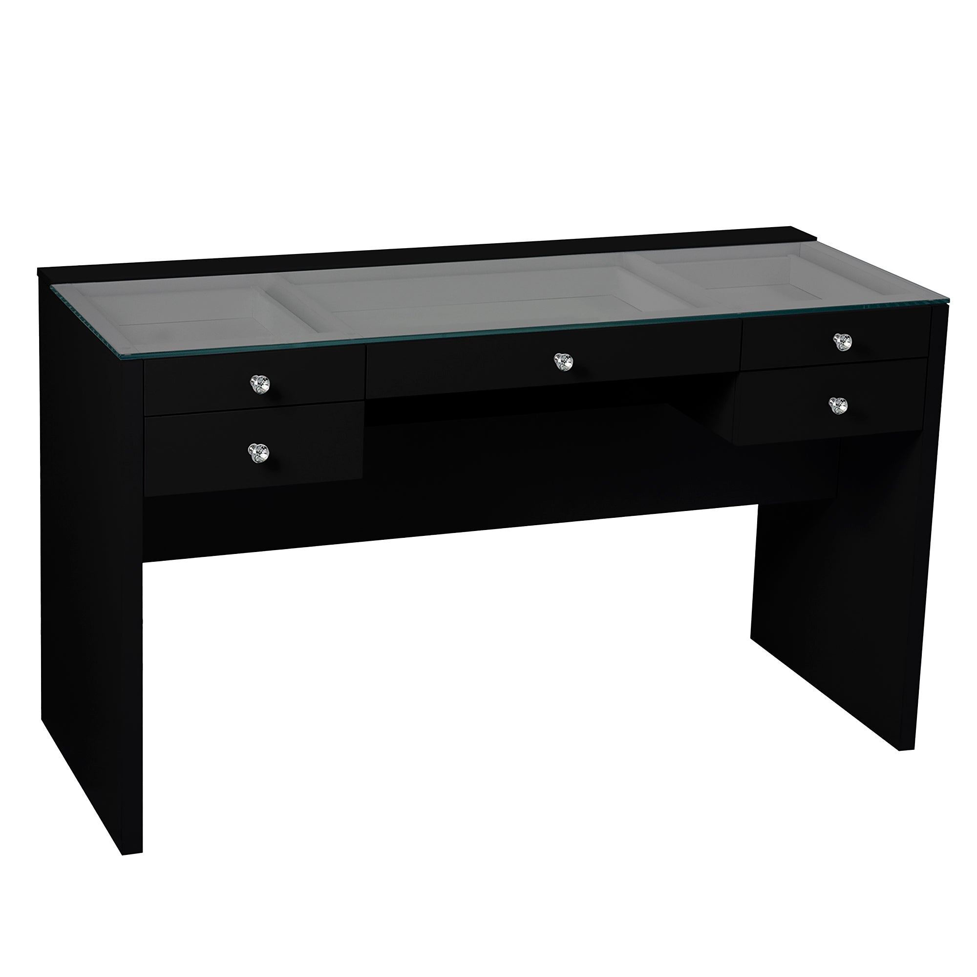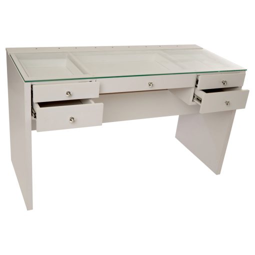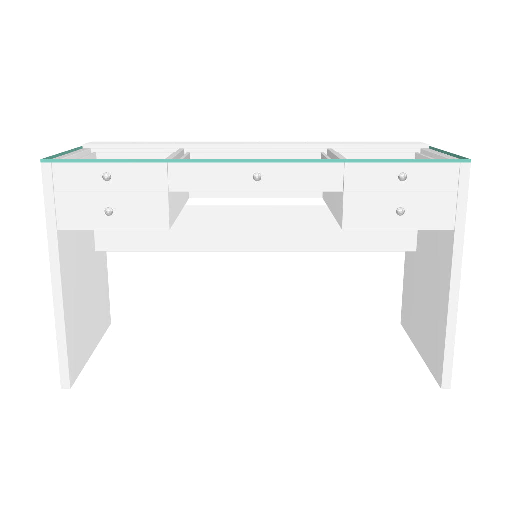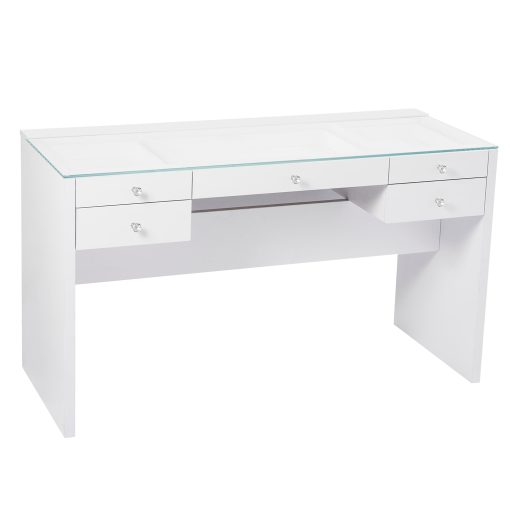 Get ready to showcase all of your vanity accessories in our SlayStation® Plus 3.0 Vanity Table! Featuring an edge-to-edge flawless clear glass top to showcase your vanity accessories! Includes five soft-close drawers with our crystal lux drawer knobs. Our Hollywood Glow® Plus or Hollywood Glow® Pro Vanity Mirrors easily mount on this SlayStation® top for a beautiful, seamless look.