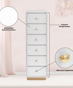 Introducing The Hello Kitty® SlayStation 6-Drawer Makeup Vanity Storage Unit ✨ This freestanding unit is the most Kawaii storage solution to grace your glam room. You get six spacious drawers to store and protect all your faves, from clothing to accessories, makeup and more. The best part is that each unit is adorned with specialty knobs and an all-over pattern on the front panel featuring Hello Kitty’s iconic silhouette. **Wipe clean with soft damp cloth. Avoid using harsh chemicals on printed surface**