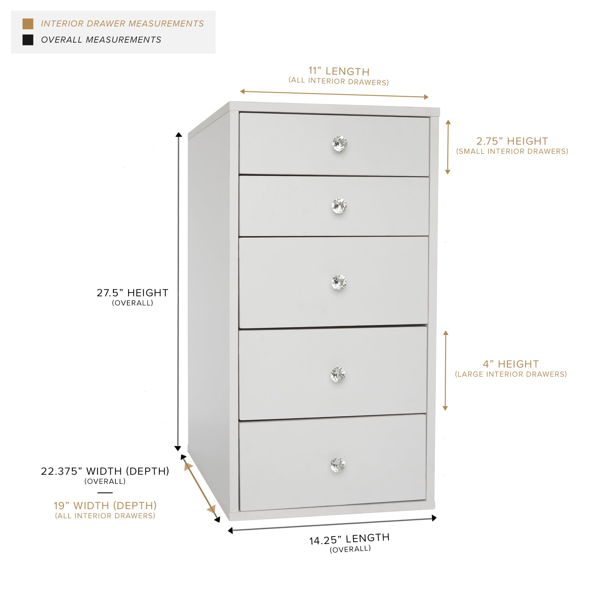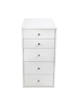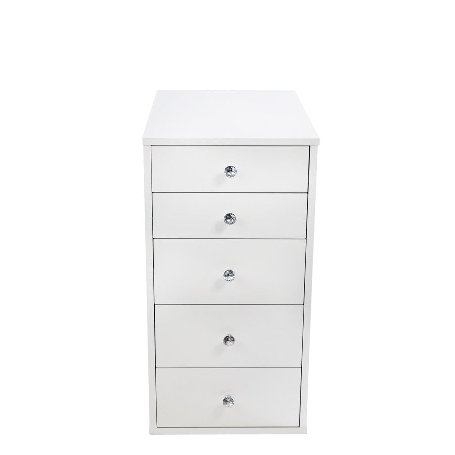 Cue in our signature SlatStation® Vanity Storage Units for that chic look to your vanity set-up! Elegant if you wish to have it as a stand-alone and sturdy to support your Makeup Vanity Tabletop. Features five drawers that are highlighted with our crystal lux drawer knobs.Available in 3 classy colors.