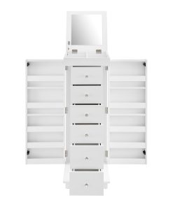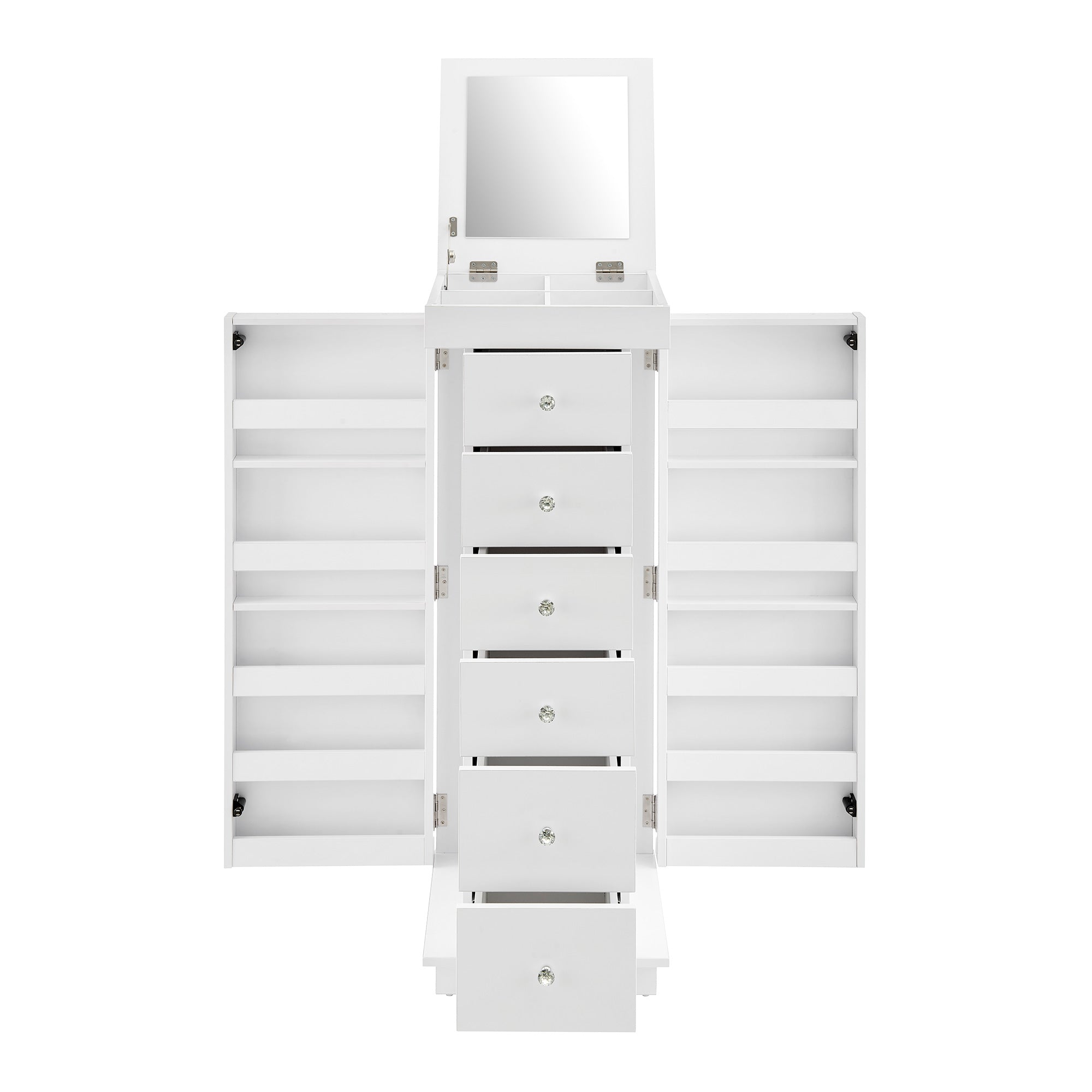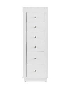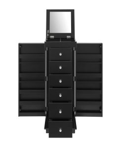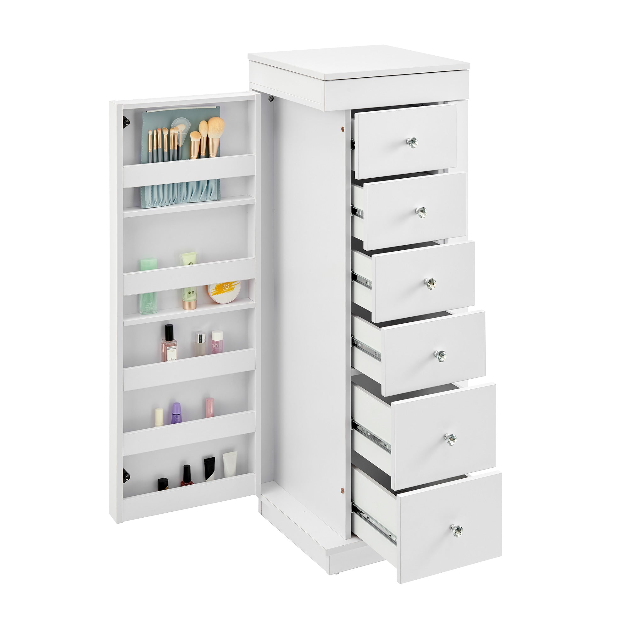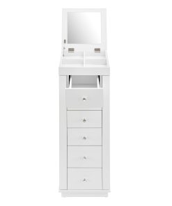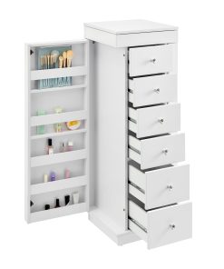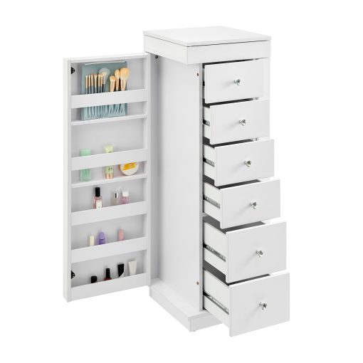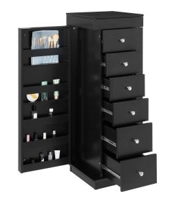 Storage space has never been so glamorous! Introducing the SlayStation Storage Armoire, this elegant piece is packed with drawers, compartments and cabinets. The Armoire features six drawers, cabinet space on either side and a lift-up, mirrored top. This freestanding cabinet is designed to promote easy access to makeup, jewelry, skincare, or daily necessities in one stop. It is sturdy and accessible with many unique features and a contemporary design that allows for multiple purposes and functions. This stylish storage armoire works for any style decor.